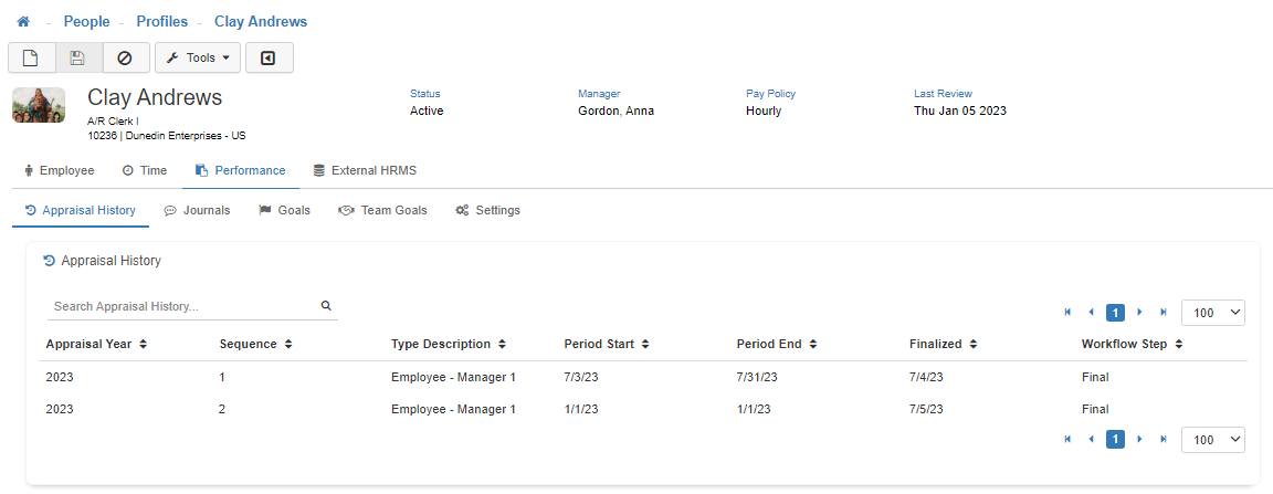 The Appraisal History tab provides a list of all historical Appraisals associated with the selected Employee's profile.