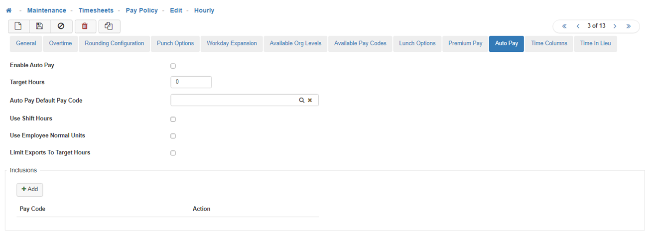 Note: The system will include any inclusions (the Pay Codes added below) as part of the Target Hours. This means if a Timesheet has 6 Holiday hours on a Timesheet, then the system will only add 32 hours when Auto Pay is processed. -