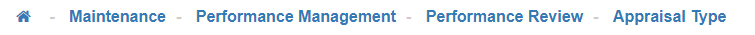 In our example above, you would currently be located in the 'Appraisal Type Maintenance'. You can click on 'Maintenance' or any of the previous stops on your 'path' to instantly be taken back from where you are. -