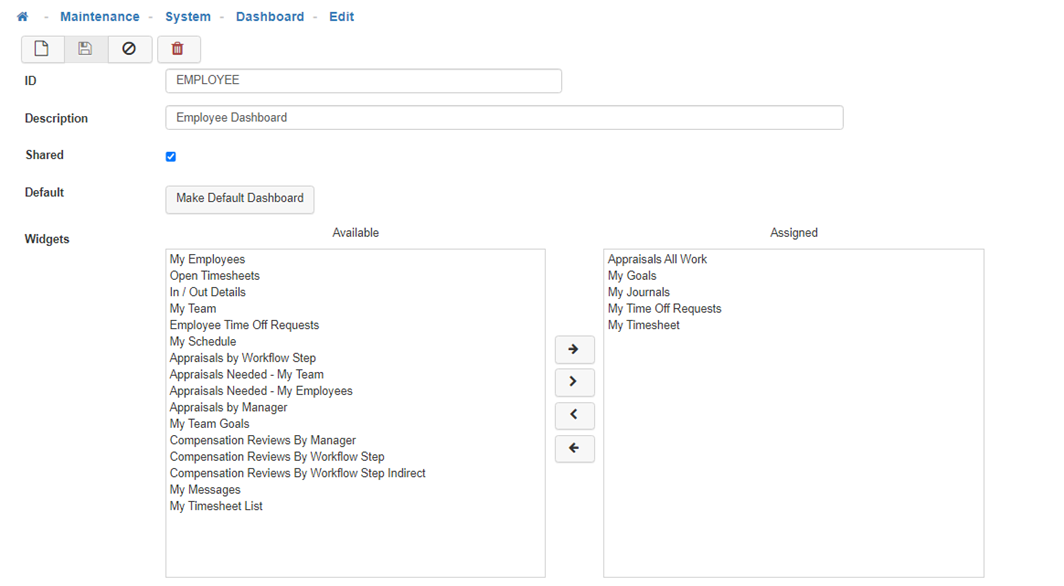 The Dashboard Maintenance lists all of the available Dashboards in your system and gives you access to edit them.