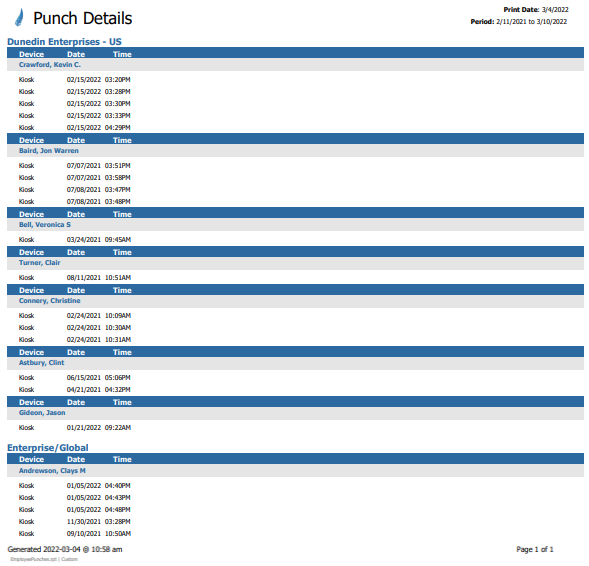 The Employee Punches report allows you to view Employee(s) Punch Details including the device they punched In/Out on, as well as the date, and the time of the punch.
