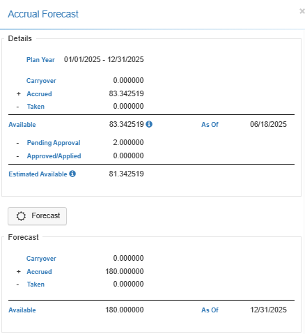 The Forecast functionality allows you to glimpse projected values from the Attendance Plan Details (Carryover, Accrued, Taken, and Available) to make it easier to make informed decisions when requesting and approving leave.