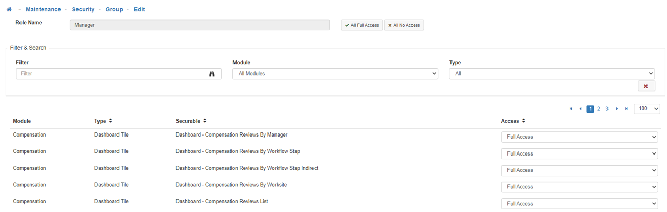 Note: If you know that all the filtered Securables listed are going to allow 'No Access' or 'Full Access' then you can select 'All No Access' or 'All Full Access' in the mass update section of the toolbar to change all the filtered items simultaneously.