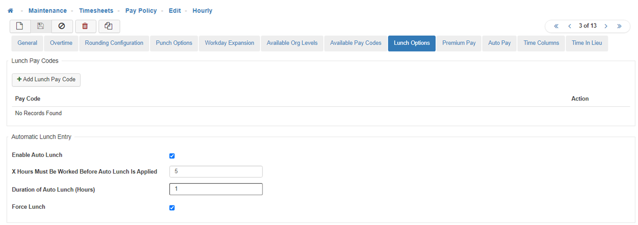 The Lunch Options Tab is where you can configure the settings for Auto Lunch and Force Lunch, as well as the Pay Codes they would apply to.