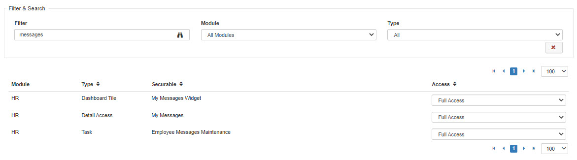 This Maintenance is controlled through Group Security by the ‘Employee Messages Maintenance’ securable. The associated ‘My Messages Widget’ and ‘My Messages’ About Me screen are controlled by securables respective to their names and type.