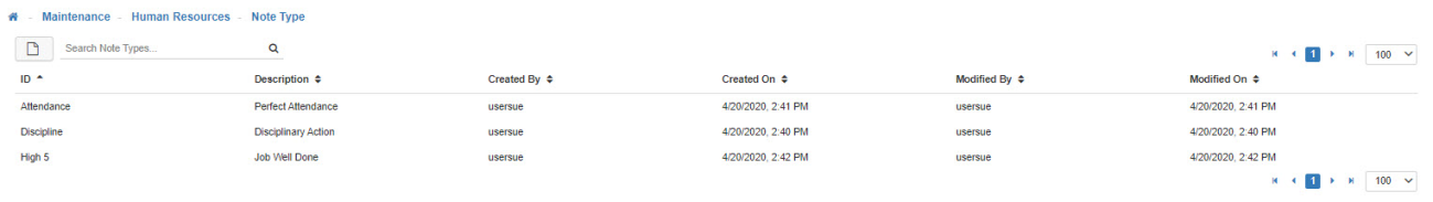 Upon navigation into the 'Note Type Maintenance', you will see a list of all configured 'Note Types' available for selection within the 'Notes' card in People. Within this screen, you can search existing values as well as select the ‘New’ button to add new note types.