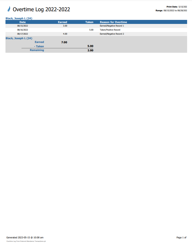The Overtime Attendance Log report shows a log of Overtime attendance transactions for a selected timeframe and Employee parameters that show overtime earned and overtime taken (as well as the corresponding reason for overtime) with calculations for remaining overtime balances.