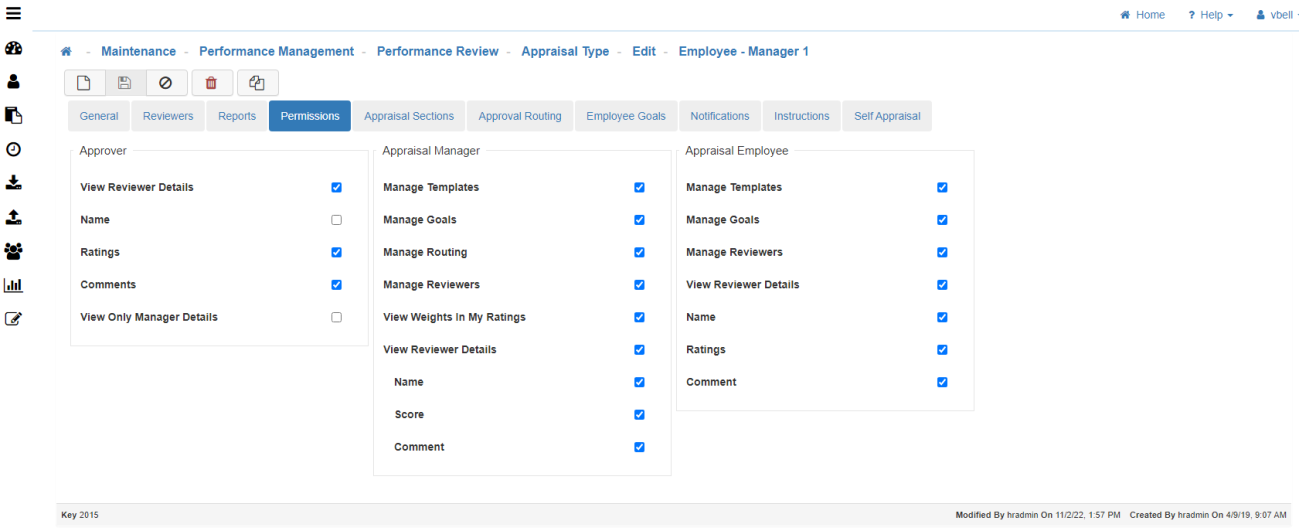The Permissions tab provides configuration options that determine what actions/views are available for the Approver(s), the Appraisal Manager, and the Appraisal Employee.