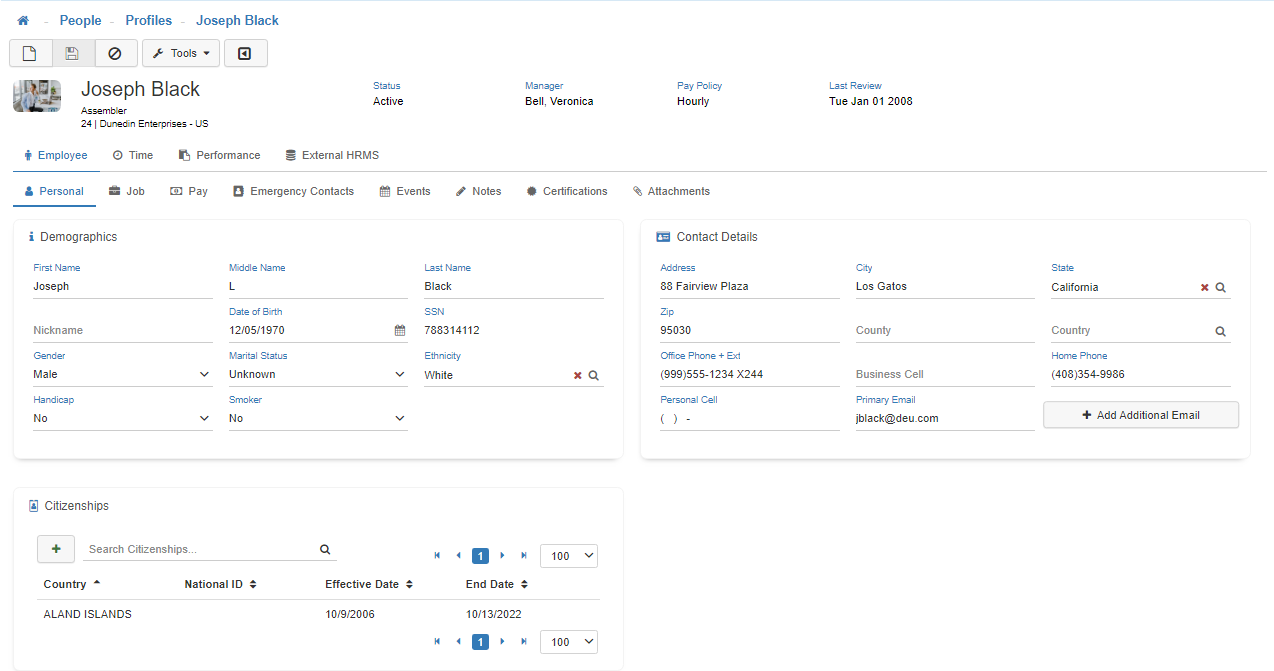 Under the Employee tab, the Personal subtab displays an Employee's personal information including Demographics, Contact Details, and Citizenship Information.