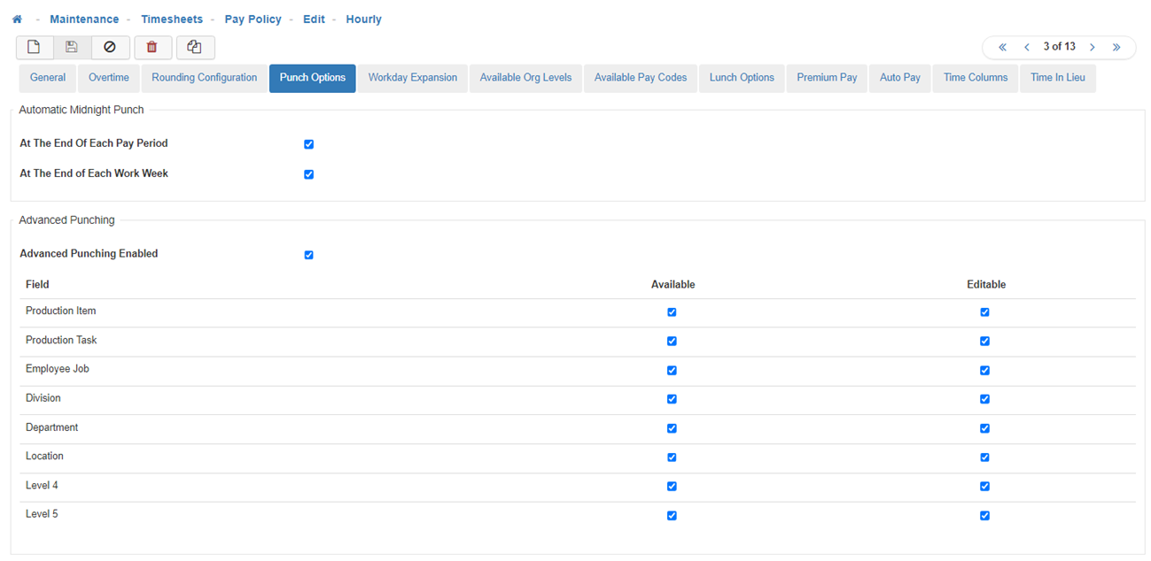 When this configuration setting is enabled it will allow Employees, that are assigned this Pay Policy, access to Advanced Punching within the Kiosks.
