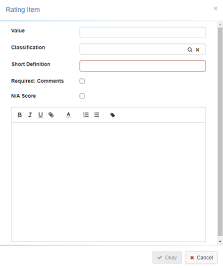 The classification may be used in combination with the competencies setup in the software. For each Competency/Scoring Classification combination, there is a list of ‘pre-defined’ phrases available for the reviewer to select from. One or more phrases may be added to the comments section of the evaluation form when reviewing each performance factor. -