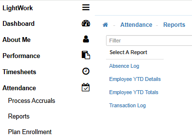 The Attendance Reports are available for review from the Employee Profiles in the Report dropdowns under the Attendance tab as well as the Attendance navigation menu 'Report' section.