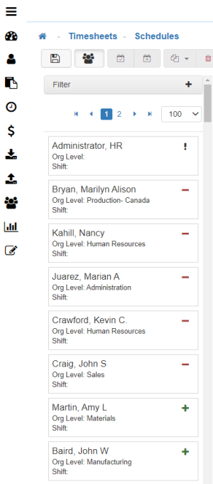 If a plus symbol is displayed this Employee is available to be added to the schedule. If a minus symbol is displayed that Employee is already on the schedule but can be removed. If you see an exclamation point that means that the Employee record does not have a job assigned so they cannot be added to a schedule.