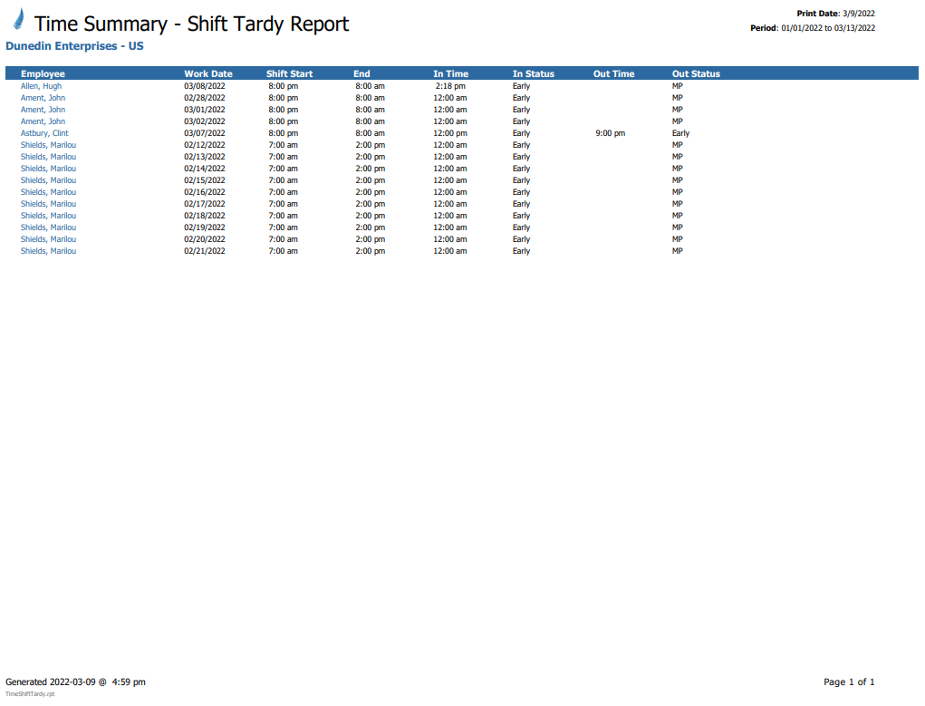 The Shift Based Tardies report allows you to review Employee(s) Tardies based on their assigned shift. Displays Work Date, with Shift Start/End and Actual In/Out times and status of Early or Late.