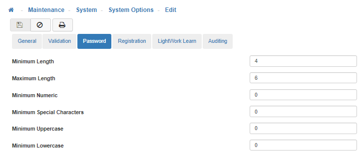 Note: Please be advised that a value of one or greater is required here, values of zero and negative integers are not accepted, and the value entered must be greater than or equal to the value entered in the Minimum Length field. -