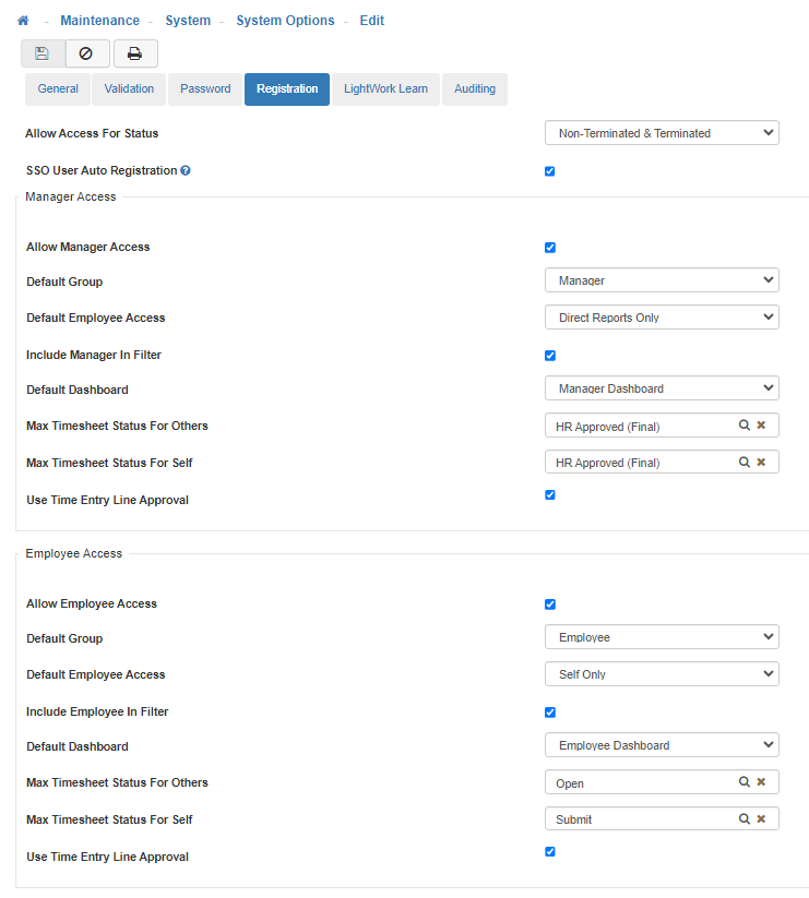 The Registration tab controls a Manager or Employee’s ability to Register with the system and the default values that will be assigned for their Role, Dashboard and Employee filter.