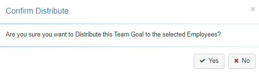 In the 'Confirm Distribute' pop-up select 'Yes' if you would like to proceed with the Team Goal Distribution, or 'No' if you would like to return to the previous screen and modify the set of Employees the Team Goal will be distributed to. -