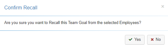 In the pop-up select 'Yes' if you would like to proceed with the Team Goal recall, or 'No' if you would like to return to the previous screen and modify the set of Employees the Team Goal will be recalled from. -