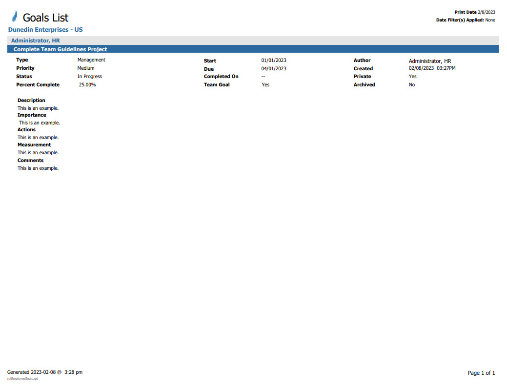 Note: To access the 'Print Team Goal Report' button set the securable Performance Management - Detail Access - Report: Team Goals to Full Access in the Group Security Maintenance. Once this is enabled, it will provide the ‘Print Goal Report’ functionality in the 'Team Goals' section of the selected Employee's profile.