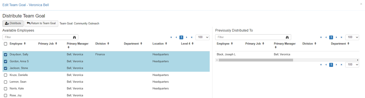 Once the Team Goal distribution has been confirmed LightWork will move the selected Employees to the 'Previously Distributed To' section. -