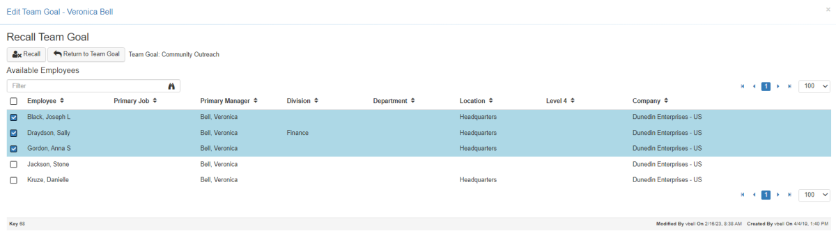 Click the checkbox next to each Employee you would like the Team Goal to be recalled from (to select all Employees in the list click the checkbox next to 'Employee') then click on the 'Recall' button. -