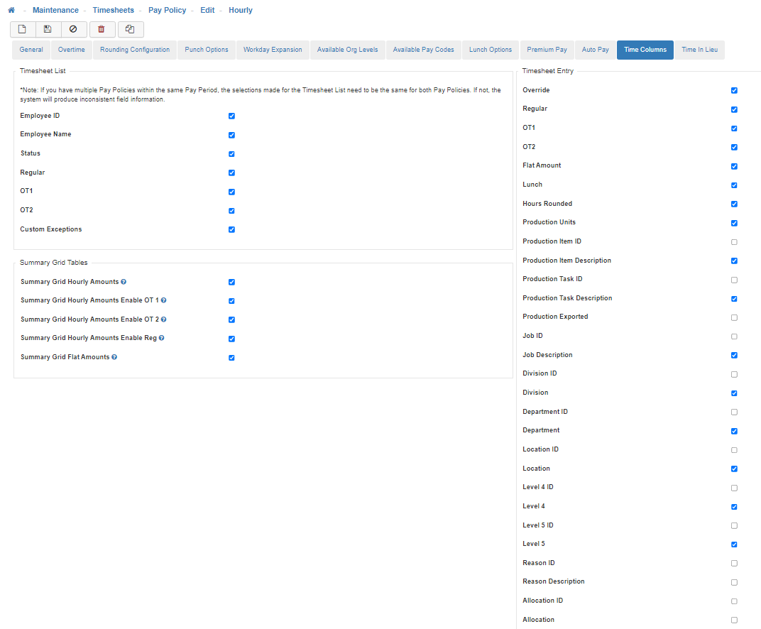 Note: If you have multiple Pay Policies within the same Pay Period, the selections made for the Timesheet List need to be the same for both Pay Policies. If not, the system will produce inconsistent field information.-