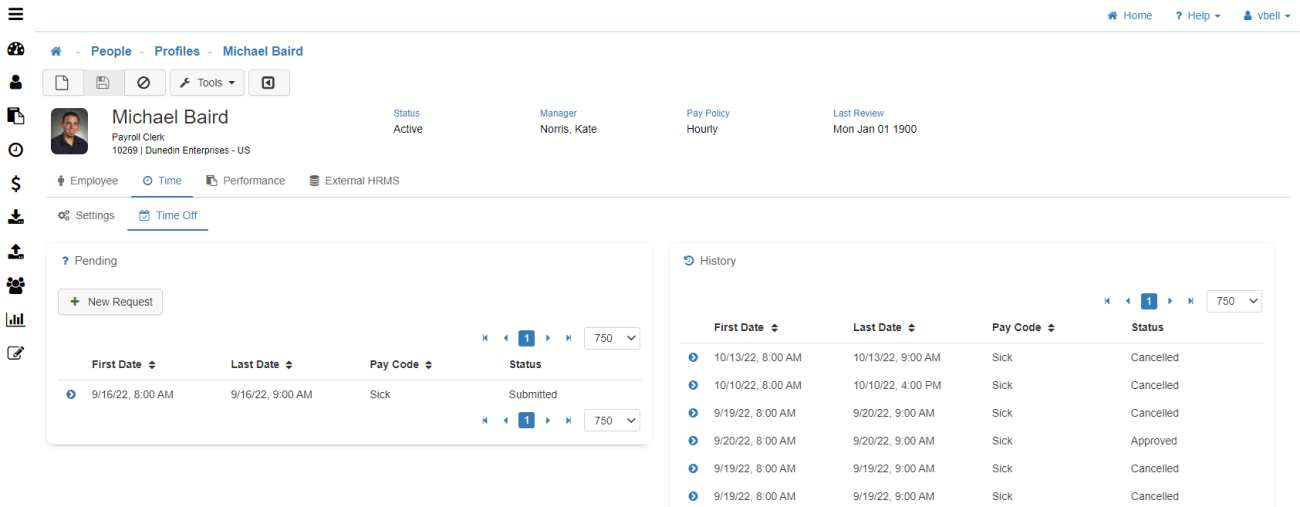 The Time Off card will provide access to the Employee's 'Pending' and 'Historical' Time Off Request information.