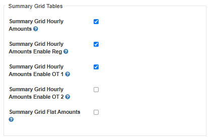 The Summary Grid is located at the bottom of a Timesheet to give a quick overview of the User's Timesheet which provides two table options; 'Hourly Amounts' which will give a breakdown by hours, and 'Flat Amounts' which provides information when paid a Flat Amount per unit of completion. When creating a new Pay Policy, the Summary Grid Hourly Amounts, Summary Grid Hourly Amounts Enable OT1, and Summary Grid Hourly Amounts Enable Reg fields, located in the Summary Grid Tables section, automatically default to enabled. All other fields within this section would need to be manually enabled, by selecting the checkbox, if you would like them to display on the Timesheets.