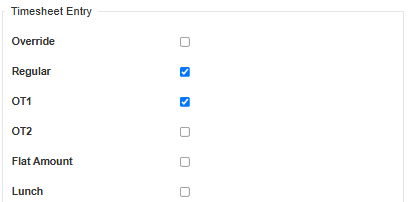 Determines what information shows on the Timesheet for each Timesheet Line. When creating a new Pay Policy, the Regular, and OT1 fields, located in the Timesheet Entry section, automatically default to enabled. All other fields within this section would need to be manually enabled, by selecting the checkbox, if you would like them to display on the Timesheets.