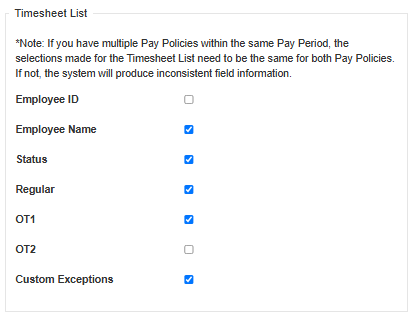 Note: If you have multiple Pay Policies within the same Pay Period, the selections made for the Timesheet List need to be the same for both Pay Policies. If not, the system will produce inconsistent field information.