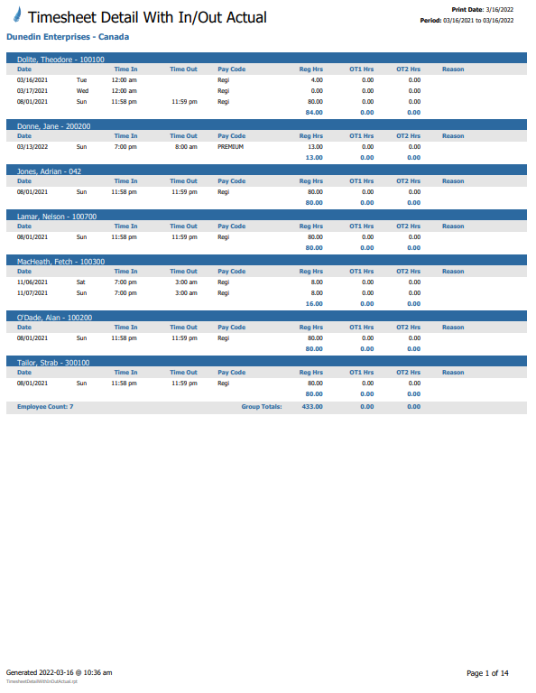 The Timesheet Detail With In/Out (Actual) report produces a list of all or specific Employee’s Timesheet(s) so a Manager can view the Timesheet(s) with the date, Time In/Out (Not Rounded) and Pay Code, hour totals, and any applicable Reason Codes.