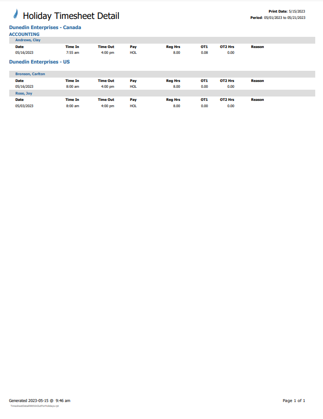 The Timesheet Detail With In/Out (Holidays) report produces a list of all or specific Employee’s Timesheet(s) with Holiday-related context. This report includes Timesheet(s) information; date, Time In/Out, Pay Code, hour totals, and any applicable Reason Codes.