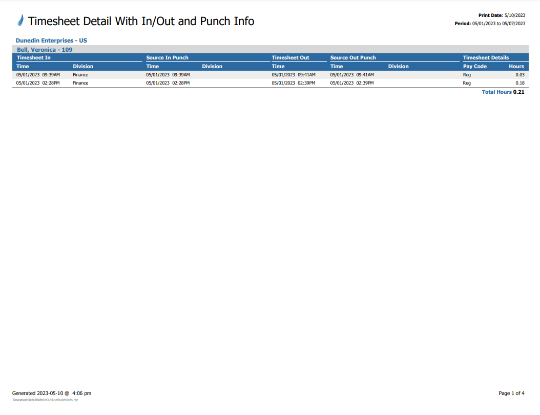 The Timesheet Detail With In/Out (Punch Info) report produces a list of all or specific Employee’s Timesheet(s) so a Manager can view the Timesheet(s) Punch Information with Timesheet In/Out Punch, and Source In/Out Punch, date and time information, as well as Pay Code and hour totals.
