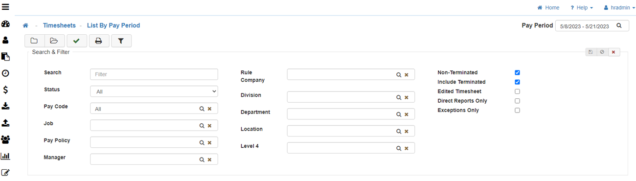 Opens up the 'Search & Filter' options for the Timesheet List in the selected Pay Period. These options allow you to filter out Employees from the list. Use the 'Search & Filter' to find a specific Employee or a group of Employees.