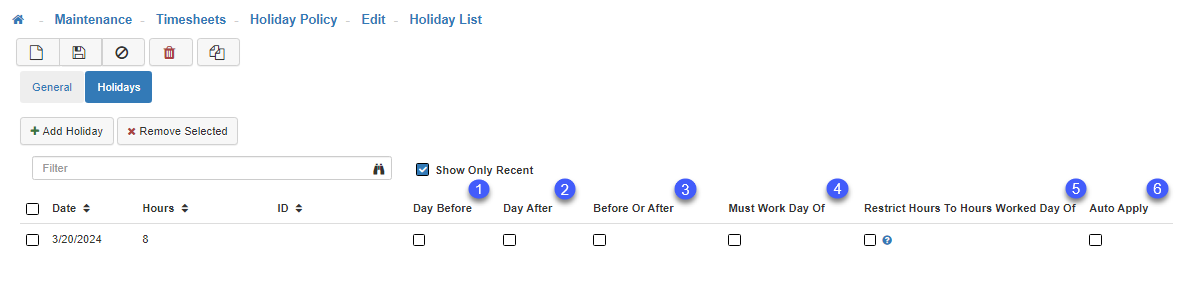 You’ve successfully run the Holiday Pay process, but aren’t seeing the Holiday populate in the Timesheets where you’d expect? The first step is to navigate into the Holiday Policy Maintenance by going to Maintenance > Timesheets > Holiday Policy. This will allow you to review the Holiday Policies that are set up in your system. Once you’ve selected the policy you’d like to review click the ‘Holidays’ tab. The boxes within each of the columns numbered below, if checked, are the requirements that are enabled that an Employee must accomplish to qualify to receive that Holiday.