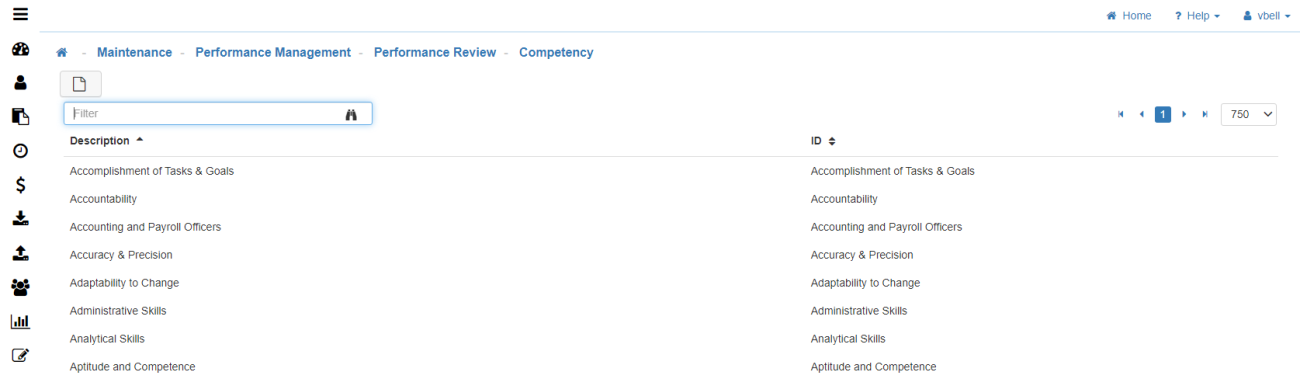 The Competency Maintenance allows you to create Compentencies for the purpose of allowing HR to tag Performance Factors to Competencies. Employees can then be reviewed on how well they are doing in a specific Competency (such as Accuracy & Precision, Communication, etc.) across the Organization, within their Department/Location.