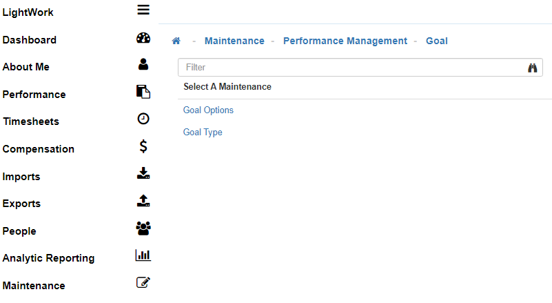 The Goal Maintenance allows for the setup and general function of the Goals and Team Goals within your LightWork system. I.e. Available fields when creating a Goal, Privacy Settings, who is allowed to create a Goal, as well as editing and deletion rights.