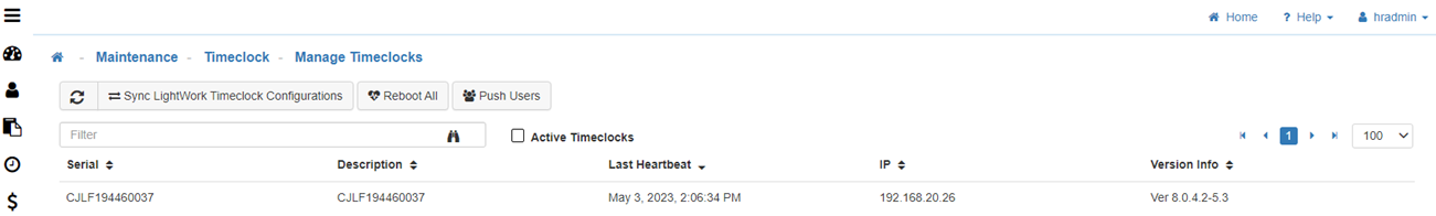 The Manage Timeclocks Maintenance is where you can monitor the 'Last Heartbeat' of all your Timeclocks, which is the last time that the Timeclock checked in with the LightWork system.