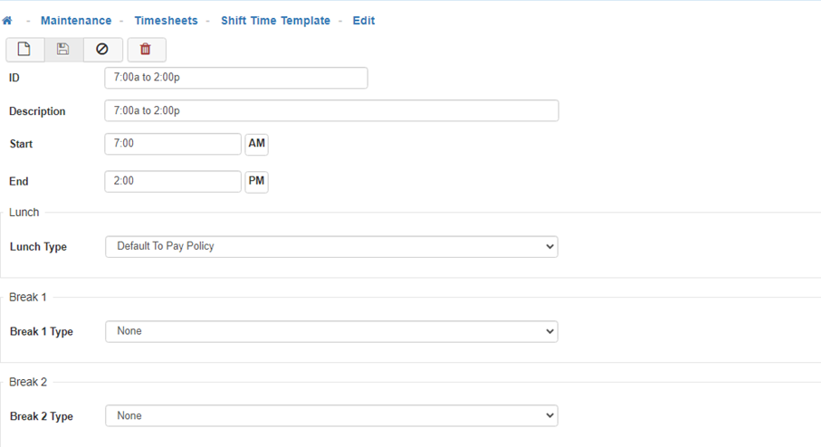 The Shift Time Template Maintenance is where you build out the time frames that Employees work.