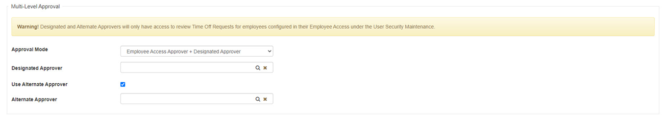 This configuration option allows for changing the Approval Mode from ‘Employee Access Approver(s) Only’ mode by default to the ‘Employee Access Approver + Designated Approver’. By selecting the mode that includes designating multi-level approval, you can select a ‘Designated Approver’ as well as an ‘Alternate Approver’. The ‘Employee Access Approver(s) Only’ mode is the standard level of approval for Time Off Requests where an Employee’s Manager would be able to ‘Approve’ a submitted Time Off Request based on their User’s Employee Access settings. -