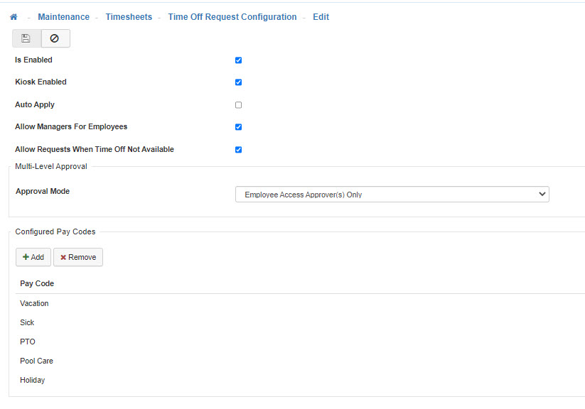 This configuration option controls which Pay Codes are available for selection within the request screen of Time Off Requests. -
